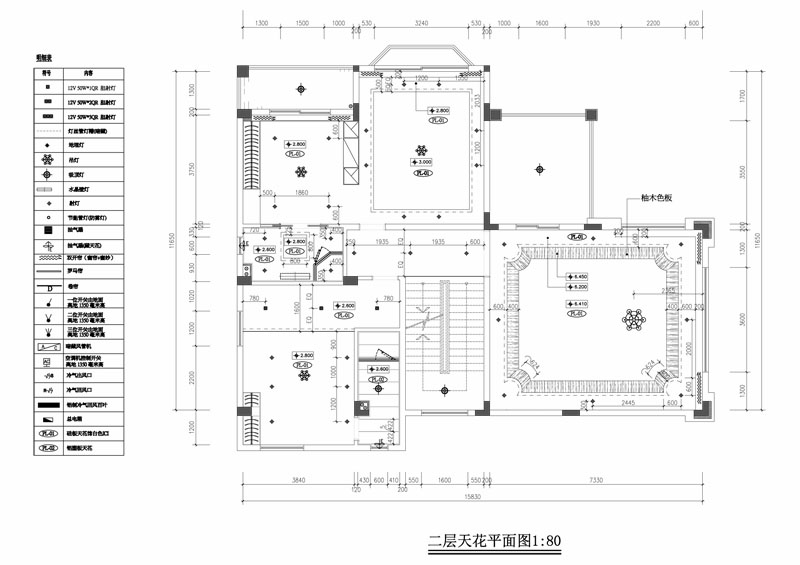 1、中空大廳做一個方型的天花池,池四周用T5-LED燈管做暗槽,四邊配LED天花燈(筒燈)做補充照明,中間裝LED蠟燭球泡做的水晶吊燈。 2、樓梯和走道的天花裝COB的LED方形射燈。 3、主人房做一個造型的天花暗槽放T5-LED燈管,天花池外四周配LED天花燈(筒燈),中間裝LED蠟燭球泡做的吊燈。 4、書房裝LED筒燈做主要照明,中間裝明裝吸頂燈。 5、小孩房做一個簡單造型的天花暗槽放T5-LED燈管,四周配LED天花燈(筒燈),中間裝吸頂燈。 6、衛生間正中各裝LED吸頂廚衛燈。 7、露臺裝LED吸頂燈。